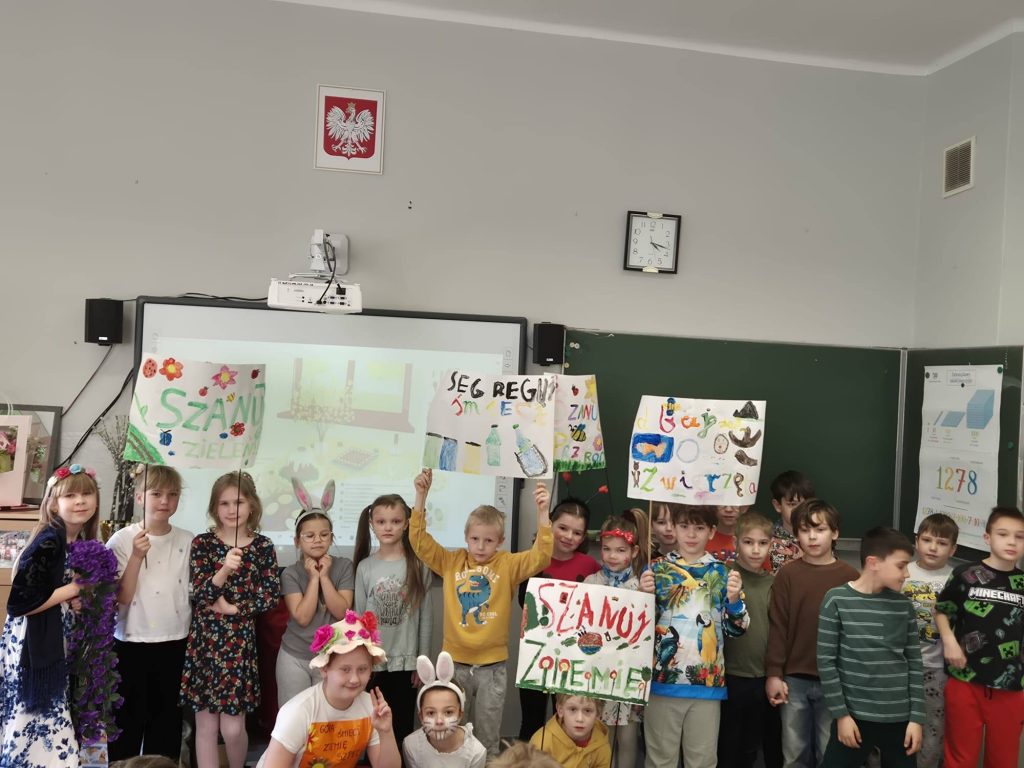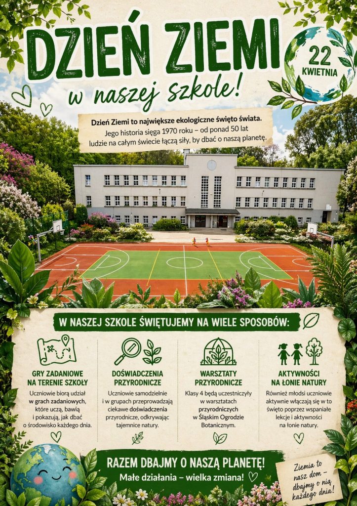 Dzień Ziemi to wyjątkowe święto, które przypomina nam, jak ważna jest troska o naszą planetę. Jego historia sięga 1970 roku i od tamtej pory inspiruje kolejne pokolenia do działań na rzecz środowiska. W naszej szkole świętujemy ten dzień na wiele różnych sposobów. Uczniowie biorą udział w grach zadaniowych na terenie szkoły, samodzielnie i w grupach przeprowadzają doświadczenia przyrodnicze, a klasy czwarte uczestniczą w warsztatach przyrodniczych w Śląskim Ogrodzie Botanicznym. Również młodsi uczniowie aktywnie włączają się w obchody Dnia Ziemi poprzez ciekawe lekcje, działania ekologiczne i aktywności na łonie natury. To piękne święto pokazuje, że o Ziemię można dbać każdego dnia – przez naukę, działanie i codzienne małe wybory.